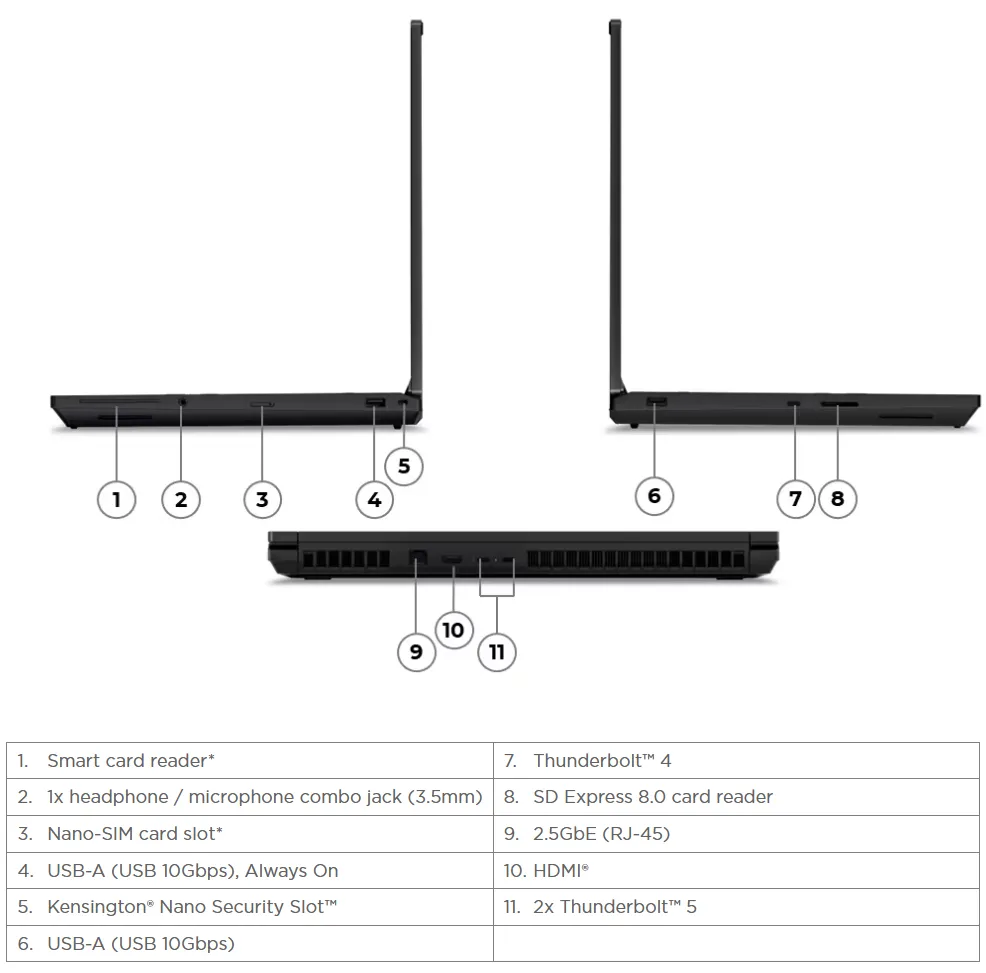 | Liidesed | 2x Thunderbolt 5, 2x USB-A, 3x USB-C, Thunderbolt 4/USB 4, HDMI 8K, RJ45 LAN, heli/mikrofon, SD mälukaardilugeja |