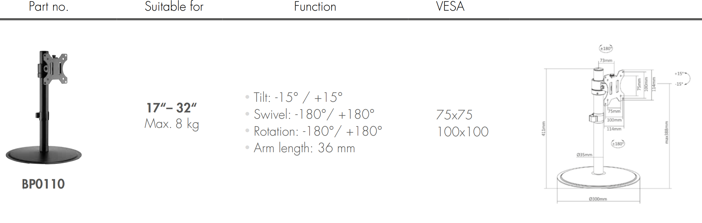 VESA mounting interfaces 75 x 75, 100 x 100 mm